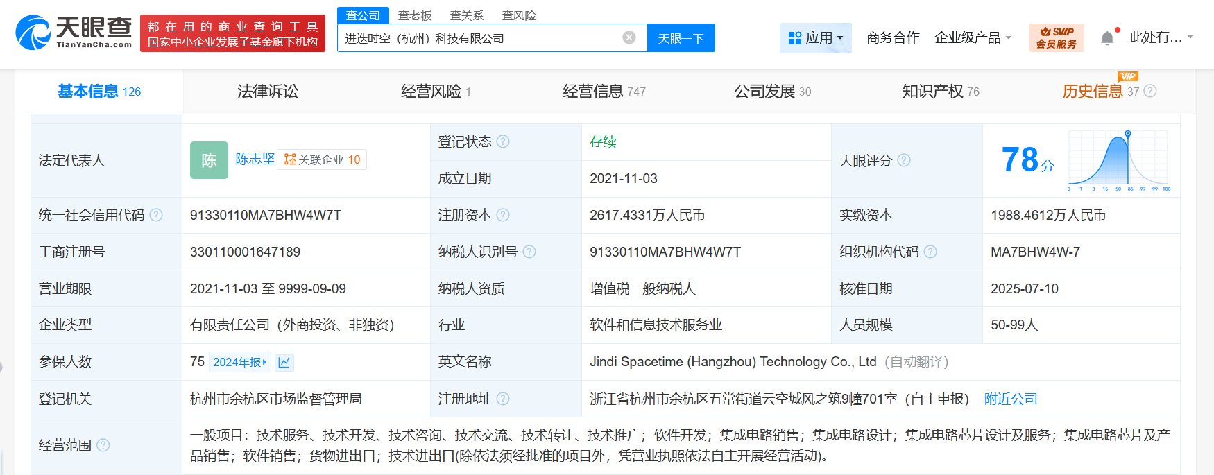 进迭时空(杭州)科技有限公司成立于2021年11月,法定代表人为陈志坚,经营范围含软件开发、集成电路销售、集成电路设计、集成电路芯片设计及服务、集成电路芯片及产品销售、软件销售等,现由珠海行芯投资合伙企业(有限合伙)、珠海衡芯投资合伙企业(有限合伙)、陈志坚及上述新增股东等共同持股。