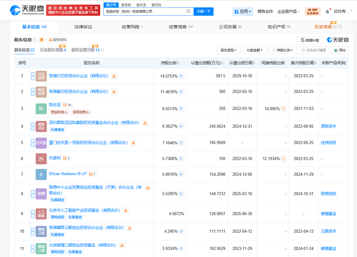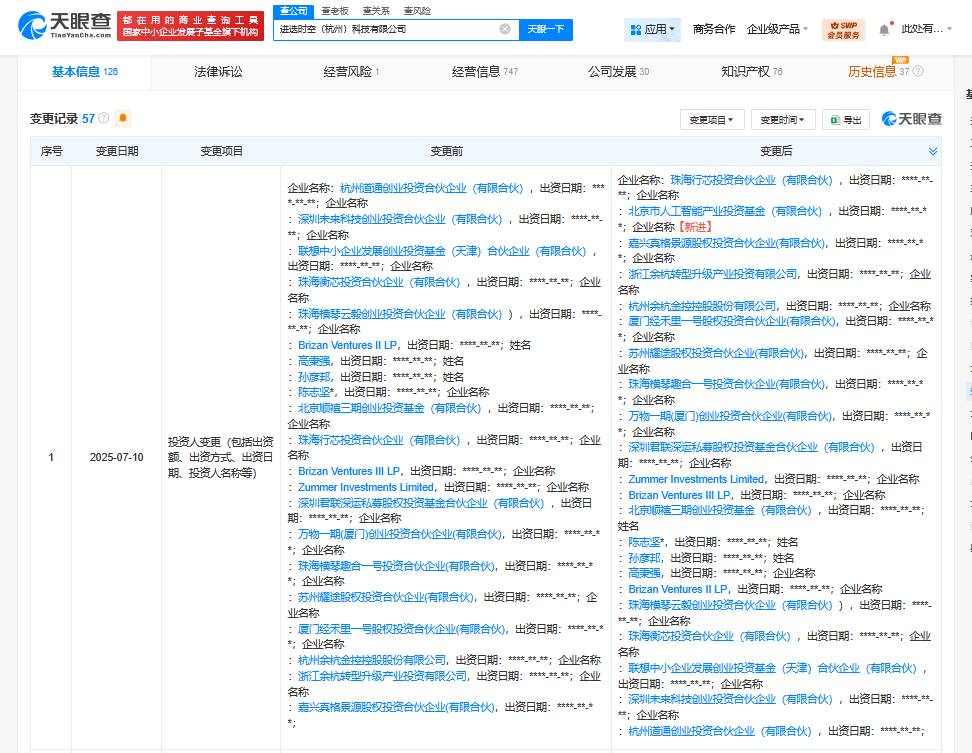 天眼查App显示,近日,进迭时空(杭州)科技有限公司发生工商变更,新增北京市人工智能产业投资基金(有限合伙)为股东,注册资本由约2497万人民币增至约2617万人民币,同时,部分主要人员也发生变更。